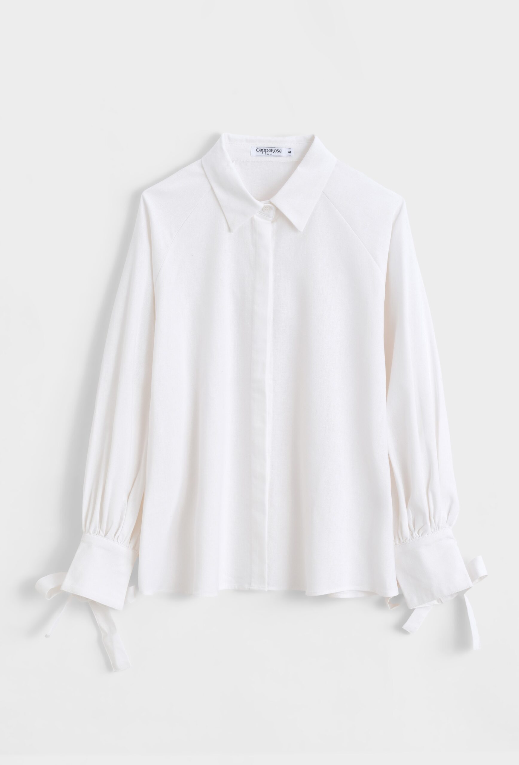 Voluminous sleeves gathered at the cuffs , finished with slits and wide self-tie ribbons.