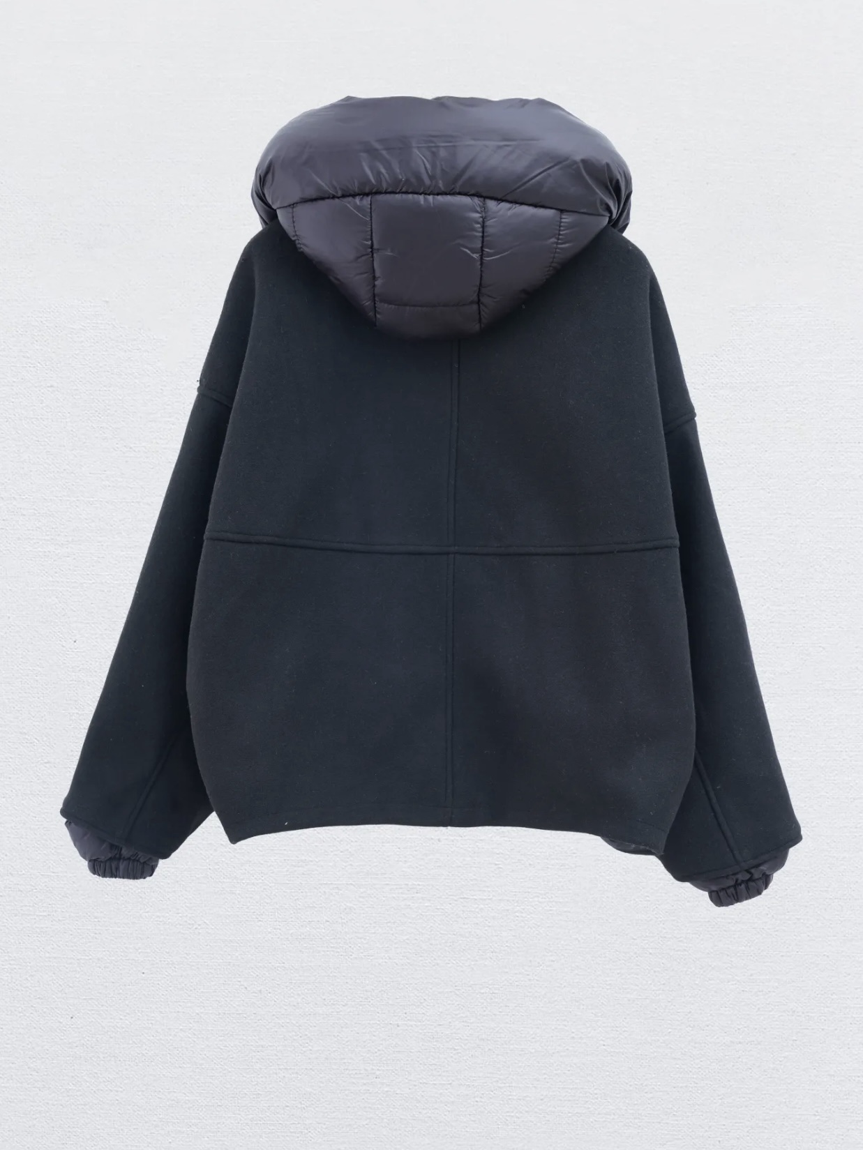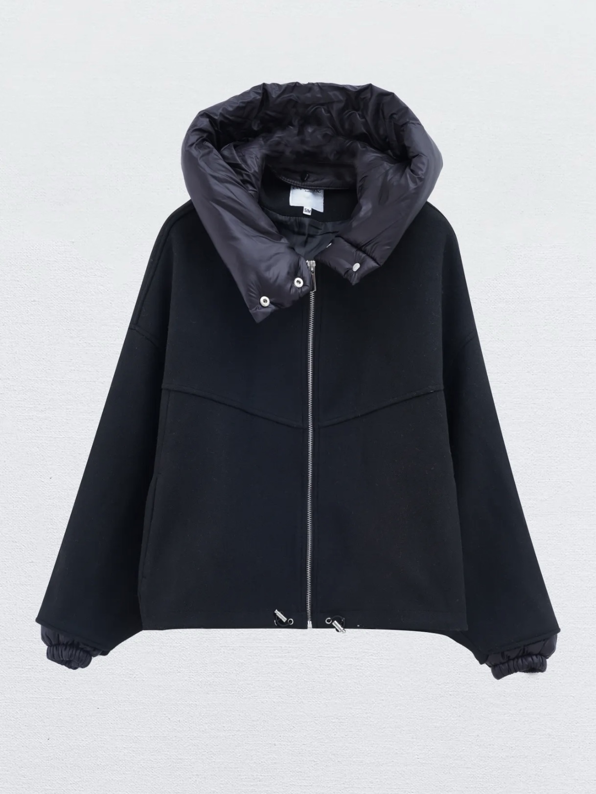 Bomber jacket met capuchon in zwart afneembare capuchon en manchetten.