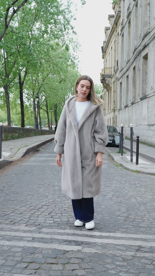 Wij zijn verliefd op deze waanzinnige faux fur coat in light grey.